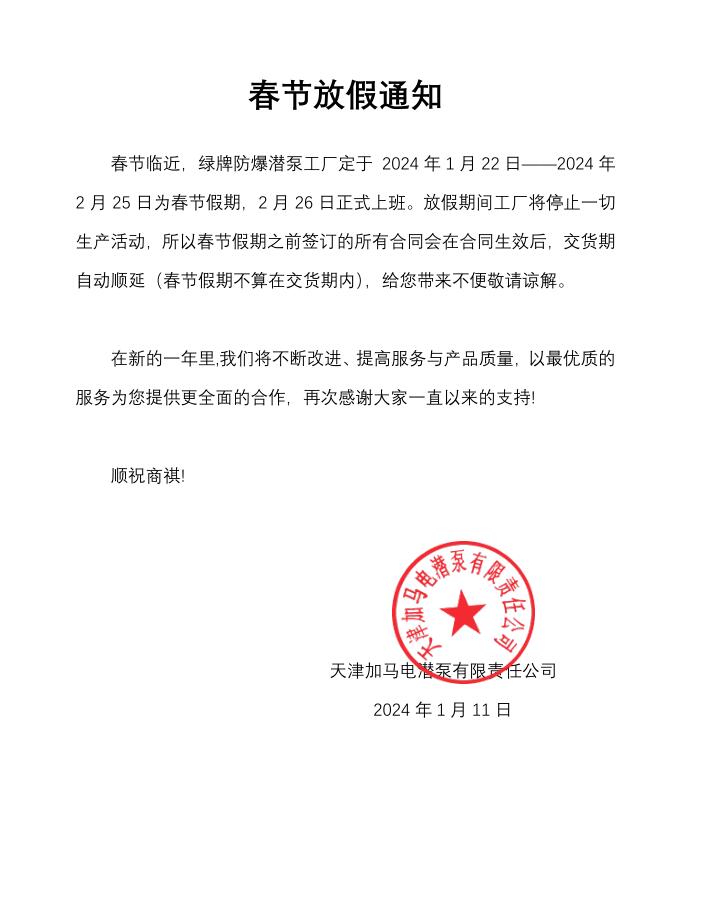 春節(jié)臨近,綠牌防爆潛泵工廠定于 2024年1月22日——2024年 2月25日為春節(jié)假期,2月26日正式上班。放假期間工廠將停止一切生產(chǎn)活動(dòng),所以春節(jié)假期之前簽訂的所有合同會(huì)在合同生效后,交貨期自動(dòng)順延(春節(jié)假期不算在交貨期內(nèi)),給您帶來(lái)不便敬請(qǐng)諒解。