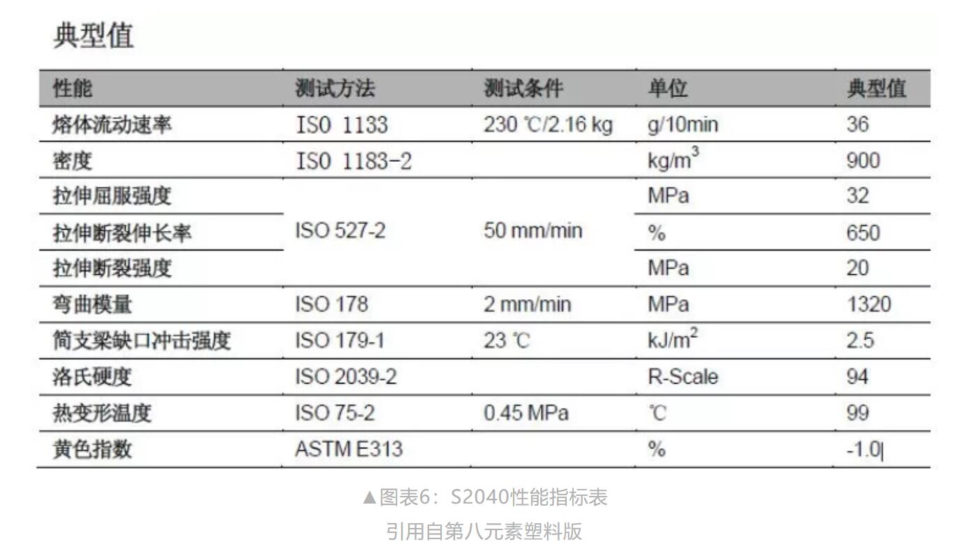 材料要求:高強度。推薦材料:熔體指數(shù)在25~60聚丙烯,比如??松梨贓xxon-Mobile的和上海賽科的2040都是很好的紡粘材料,如S2040性能指標如圖表6所示。