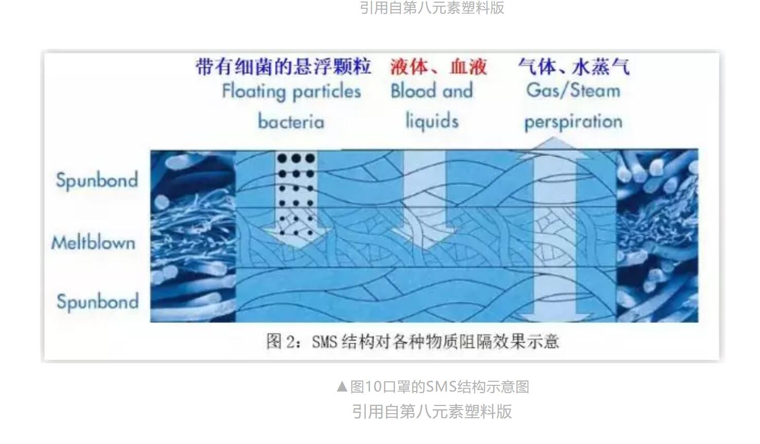 這里面紡粘層其纖維直徑比較粗,在20微米左右,2層S紡粘層主要作用是支撐整個無紡布結(jié)構(gòu),對阻隔并沒有太大的作用??谡掷锩孀钪匾氖亲韪魧蛹慈蹏妼?,熔噴層的纖維直徑比較細,在2微米左右,所以只有紡粘層直徑的十分之一,這個對防止細菌、血液滲透起至關(guān)重要的作用,經(jīng)過靜電處理后達到所要求的過濾效率。如果S紡粘層過多,口罩就比較硬,而熔噴層M過多,則呼吸比較困難,所以從口罩呼吸的難易程度可以判斷口罩的隔絕效果,呼吸越困難,則阻隔效果更好,但是,如果M層變?yōu)楸∧?,就基本上不能呼吸了,病毒是阻隔了,人也快不行了,所以,這也是一個技術(shù)問題。