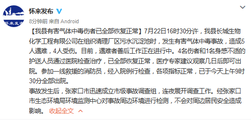 目前,遇難者善后工作正在進(jìn)行中。4名傷者和1名身感不適的護(hù)送人員通過醫(yī)院檢查治療,已全部恢復(fù)正常,醫(yī)療專家建議觀察幾日后即可出院。參加一線救援的消防員,經(jīng)入院例行檢查,各項(xiàng)指標(biāo)正常,已于7月24日上午9時(shí)30分全部出院。