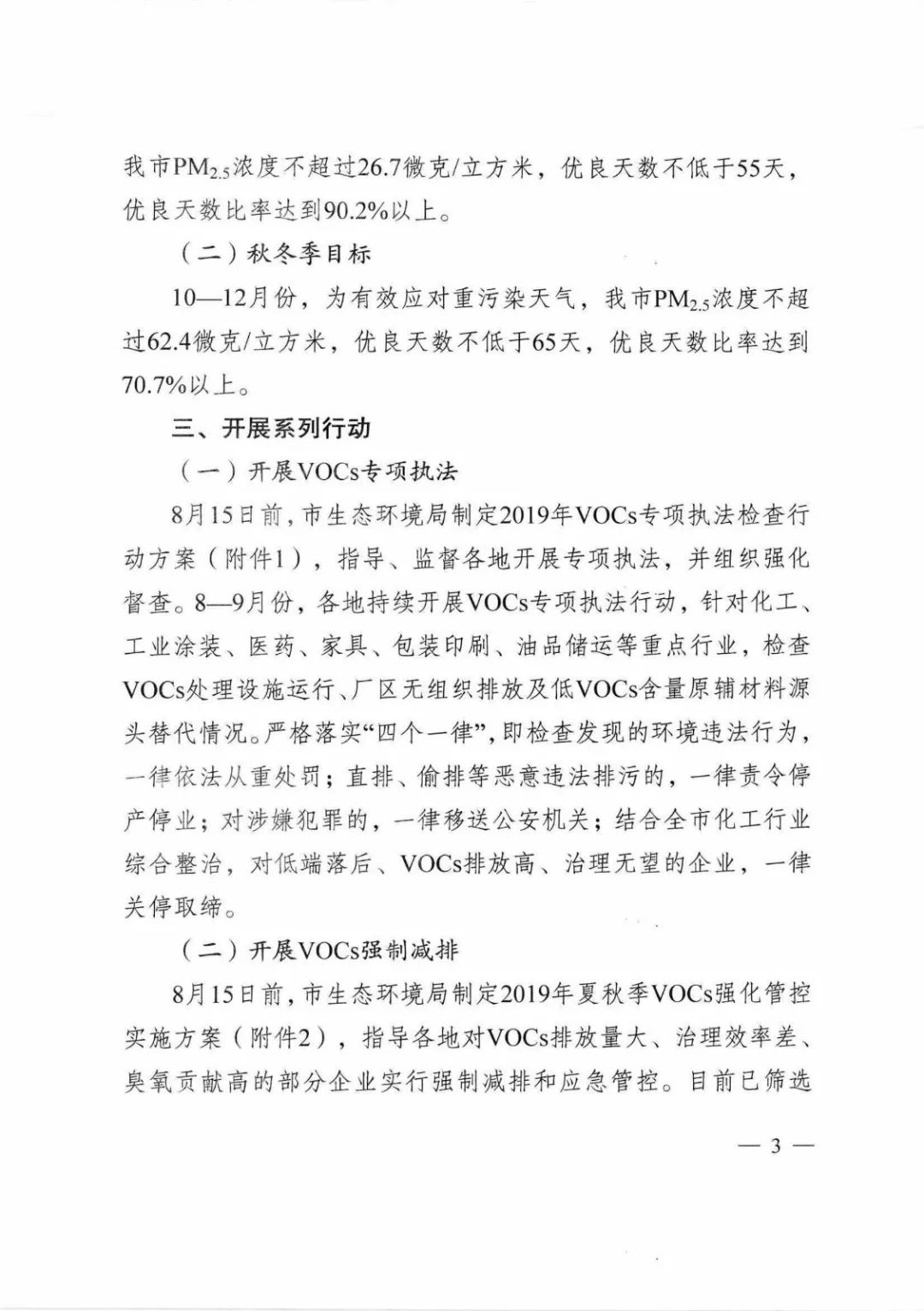 8月15日前,市生態(tài)環(huán)境局制定2019年夏秋季VOCs強化管控實施方案,指導各地對VOCs排放量大、治理效率差、臭氧貢獻高的部分企業(yè)實行強制減排和應急管控。目前 已篩選VOCs排放量較大的重點企業(yè)列入應急管控和強制減排企業(yè)清單。8-9月,各地實施VOCs強制減排。8月18日前,各地制定本地區(qū)VOCs強化管控行動方案,按照重點行業(yè)VOCs減排比例不低于50%的要求,在強制減排企業(yè)清單基礎(chǔ)上,進一步充實本地區(qū)強制減排清單,落實列入強制減排清單企業(yè)的停產(chǎn)、限產(chǎn)措施。