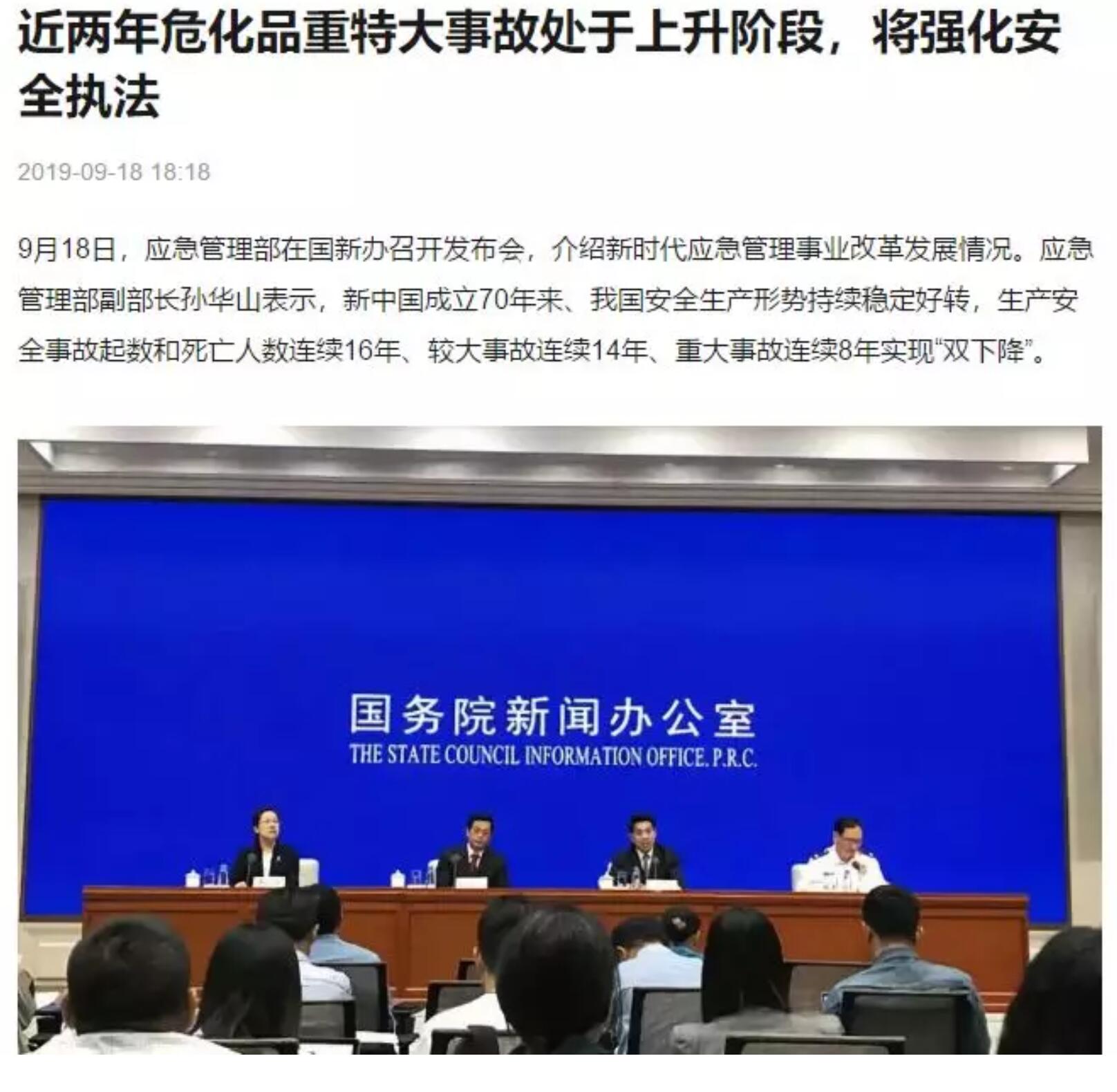 應(yīng)急管理部副部長孫華山在發(fā)布會中稱,中小企業(yè)的生產(chǎn)裝備相對落后,安全監(jiān)管力度不足,安全隱患問題突出。而危化品在生產(chǎn)、經(jīng)營、運輸、儲存、使用和廢棄處置這幾個環(huán)節(jié)中具有極大的風險,一旦處理不當,往往會造成嚴重的安全事故。